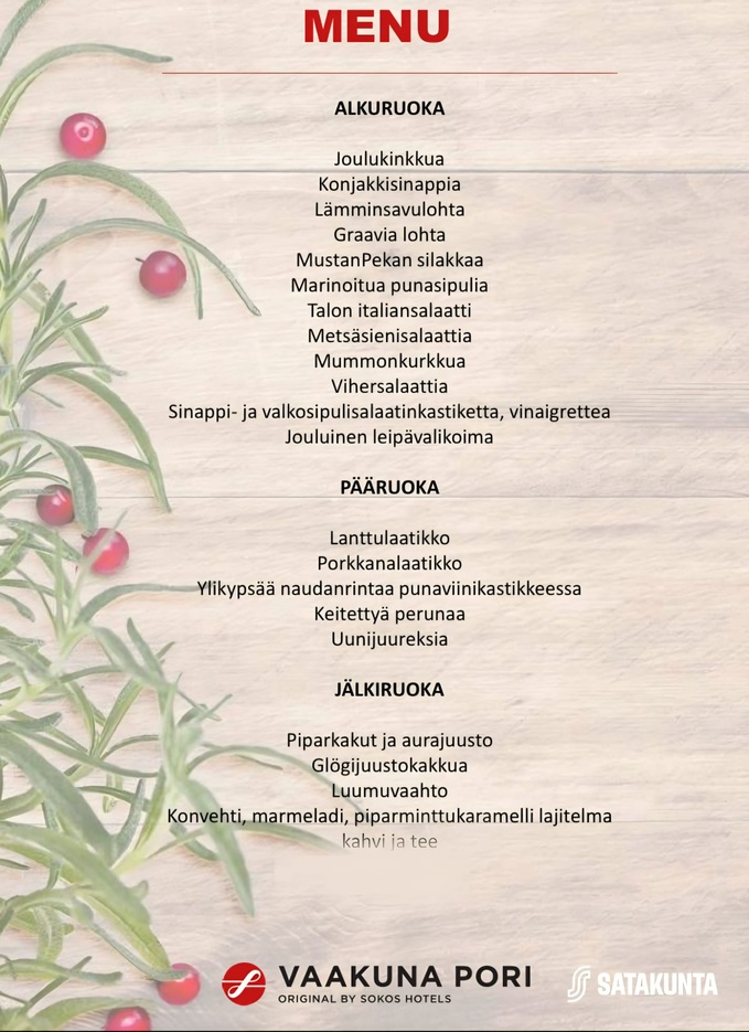 Tervehdys Porin alueen Teollisuusdemari, Haluamme kutsua sinut Teollisuus Demareiden järjestämään jouluruokailuun torstaina 4.12 klo.18:00 alkaen. Ruokailu ja tapaaminen järjestetään Porin Sokos Hotelli Vaakunan Satakunta Salissa. Tarjolla on kattavasti jouluherkkuja ja tarkempi menu alapuolelta. Ilmoittaudu tilaisuuteen tämän viikon aikana, jotta saadaan varaus vahvistettua. Terveisin Jouni NurmelaLounais-Suomen toiminta-alueen aluepäällikkö 020 774 1340 040 827 8348 jouni.nurmela@teollisuusliitto.fi |